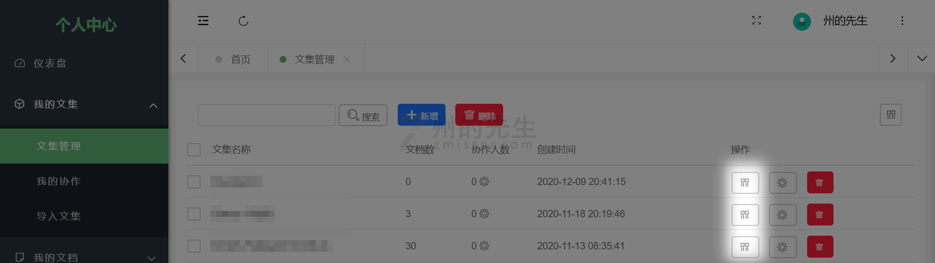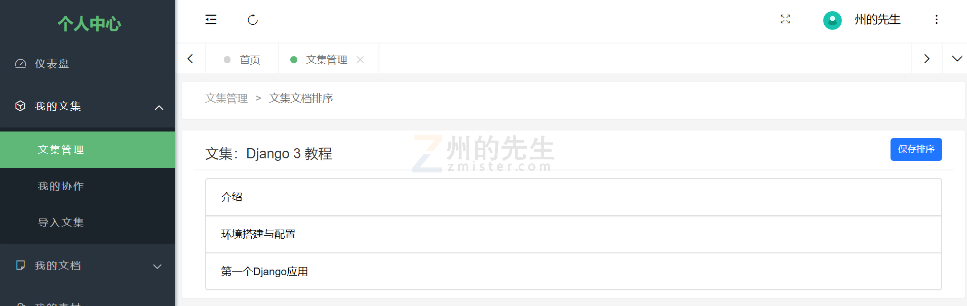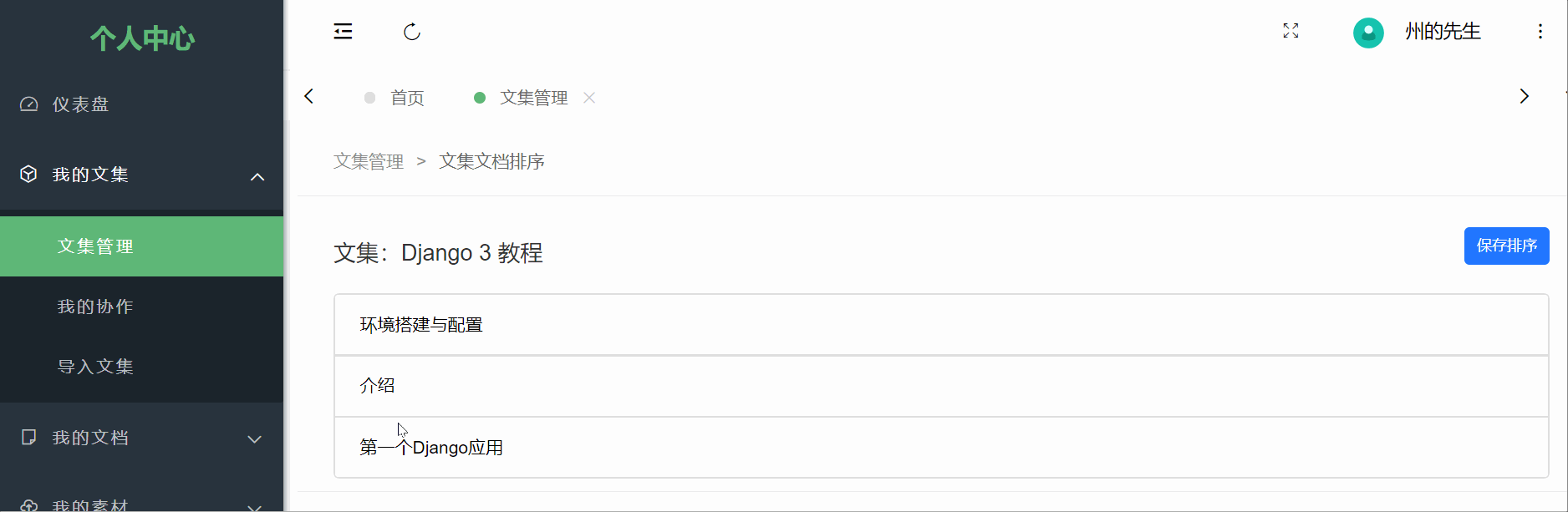 In addition to "Select Document Parent" and "Set Document Order Value" on the document editor page, Minder Note also supports drag-and-drop sorting of documents within a specified collection. In the collection list on the "Personal Center" - "File Management" page, the sort icon button in the operation bar is the function button for collection sorting, as shown below:  Clicking it will take you to the document sorting interface for the specified collection:  On this page, you can drag and drop documents to sort them, as shown below:  After completing the sorting, click the "Save Order" button in the upper right corner to confirm.