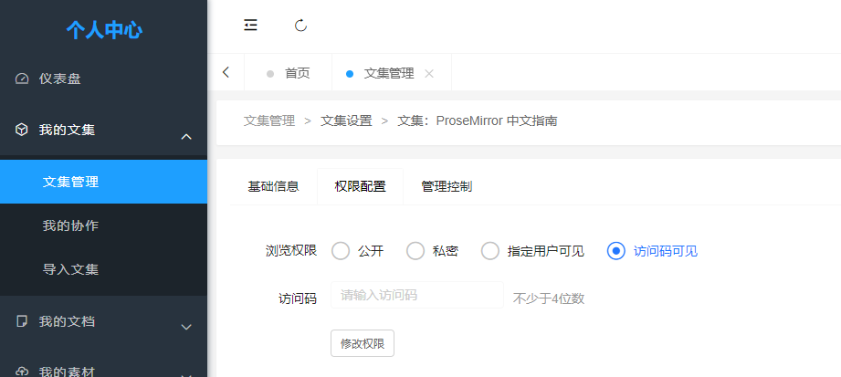 MrDoc implements permission control based on document collections, currently supporting four permission modes: - Public - Private - Specified Users - Access Code You can configure permissions for specific document collections in **Personal Center** → **Collection Management** → **Collection Settings**:  Select collection permissions:
