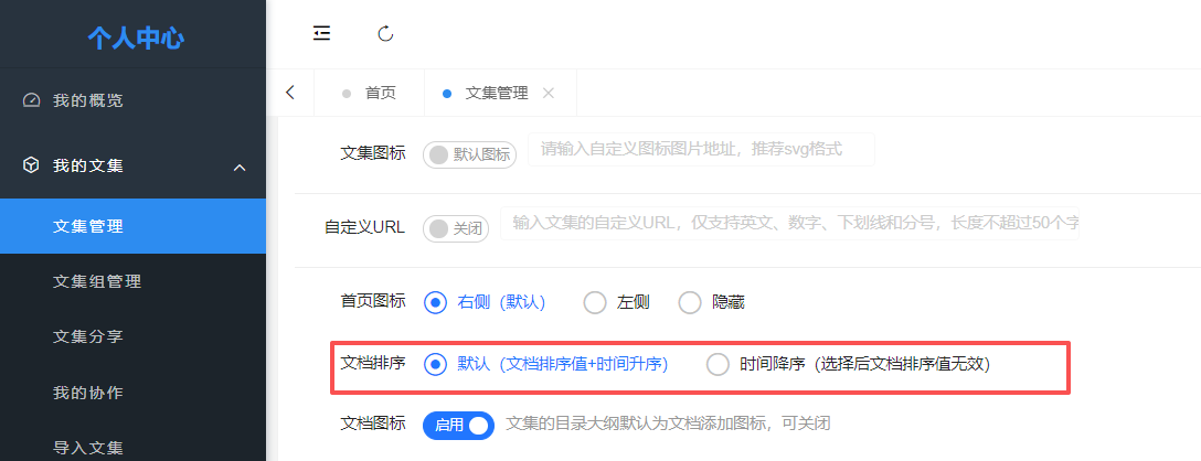 By default, the collections in MrDoc are sorted in ascending order based on the document sorting value and time. If you need to change the document sorting in the collection outline to descending order by time, you can select the "Time Descending" option under the "Document Sorting" configuration in the collection management page.  Please note that after selecting this option, the document sorting value will no longer take effect.
