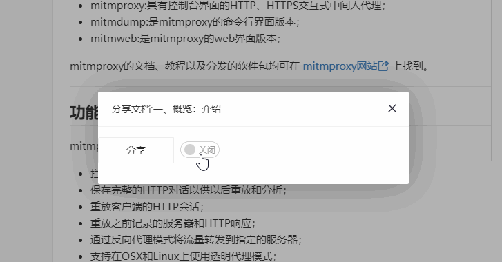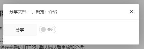 MrDoc supports sharing of documents within collections that have non-public permissions by collection authors, collaborators, and document authors. Currently, the following two sharing methods are available: - Public Sharing - Share Code Sharing To share a document, navigate to the specific document and click the "Share" button in the lower-right corner:  This will open the sharing dialog:  You can toggle the sharing switch and select the sharing mode: