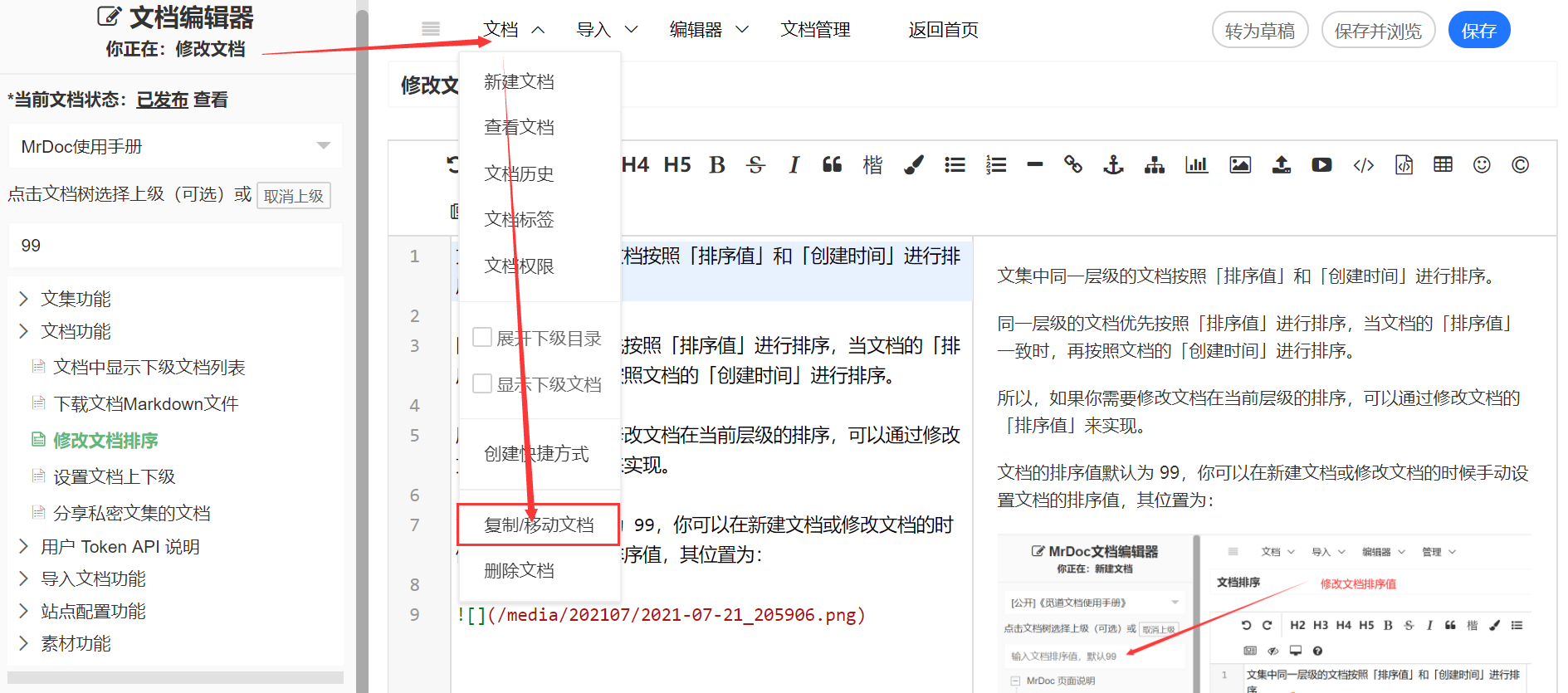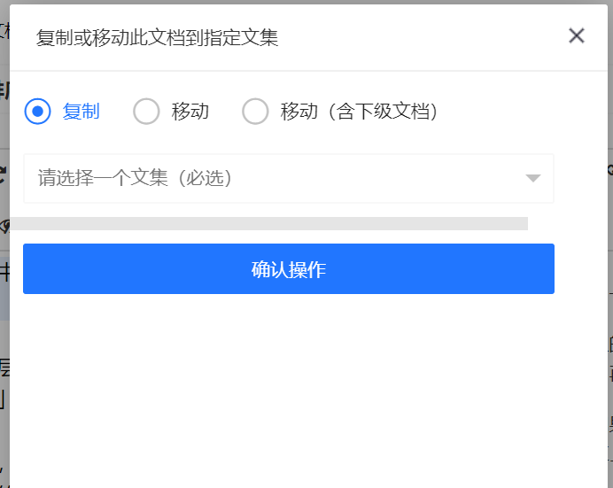 If you need to copy or move a document to another collection, you can perform the operation on the document editing page. The specific steps are as follows: Hover over the **Document** option in the top menu bar and select **Copy/Move Document**:  Then, in the pop-up dialog, select the desired operation type, choose the target collection, and click the **Confirm Operation** button.