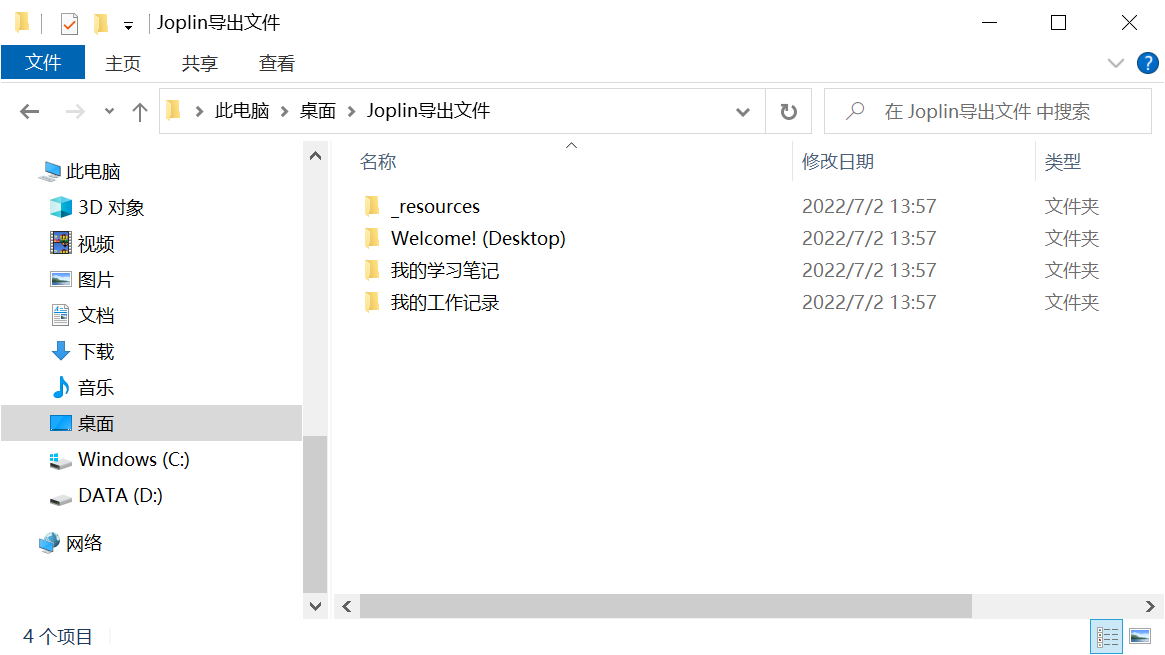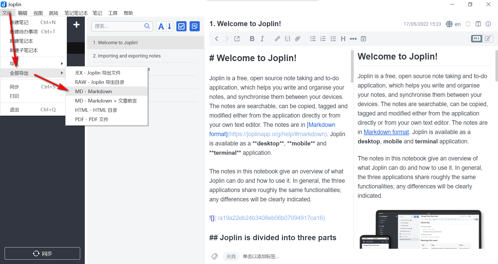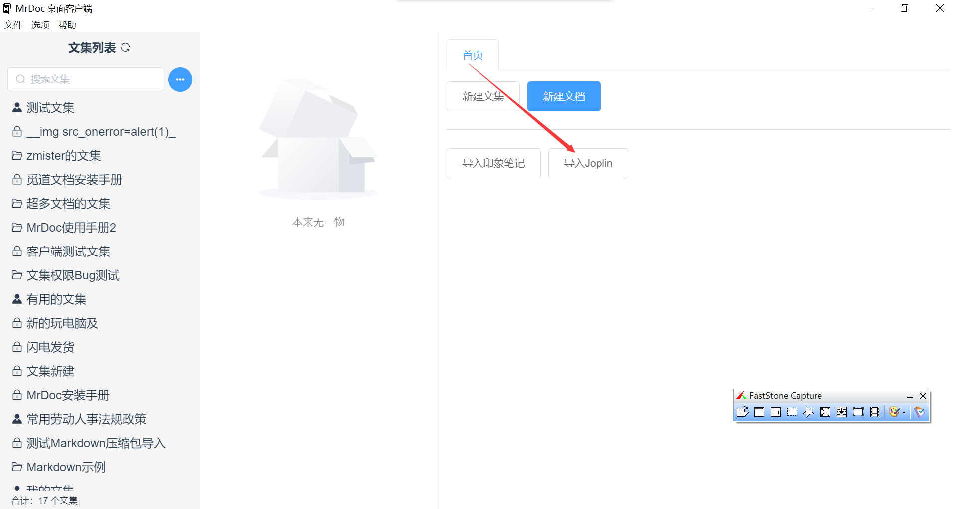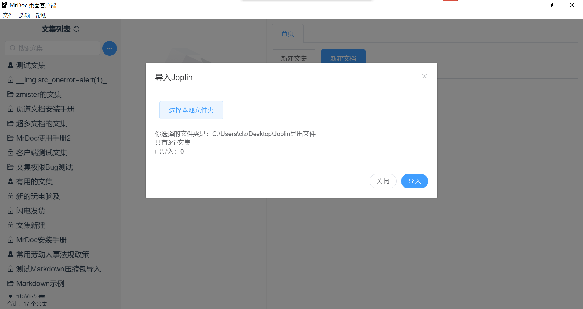 MrDoc supports importing documents from Joplin into MrDoc. ## 1. Create a New Folder First, create a new folder on your desktop to store the files exported from Joplin.  ## 2. Export Joplin Notebook Open the latest version of Joplin, click on the "File" menu, and select "Export All" → "MD - Markdown":  In the folder selection dialog that appears, choose the previously created empty folder:  Afterward, you will see that the notebooks from Joplin have been exported to the folder:  ## 3. Import into MrDoc Open the MrDoc desktop client, and on the homepage, click the "Import Joplin" button.  In the pop-up dialog, click the "Select Local Folder" button and choose the previously created folder:  Finally, click the "Import" button to complete the process.