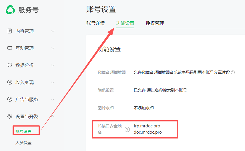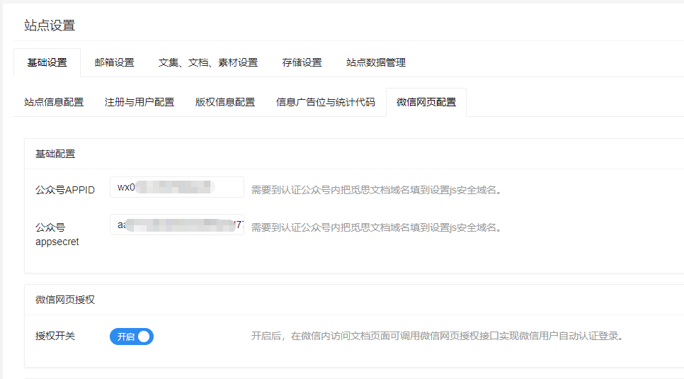 WeChat Web Authorization leverages a verified WeChat Official Account to enable automatic authentication and login when opening Minder Document links within the WeChat client by calling WeChat's authorization interface. ## Obtaining WeChat Official Account Information On the "Development Interface Management" page of the WeChat Official Account management platform, retrieve the `APPID` and `AppSecret` information of the service account:  On the "Account Settings" page, add your Minder Document domain to the "JS Interface Security Domain":  ## Minder Document Configuration In the "WeChat Web" configuration tab under the backend site management - site settings page: - Enter the corresponding WeChat Official Account APPID and APPSECRET information. - Enable the "WeChat Web Authorization" switch. This completes the configuration for WeChat Web Authorization: