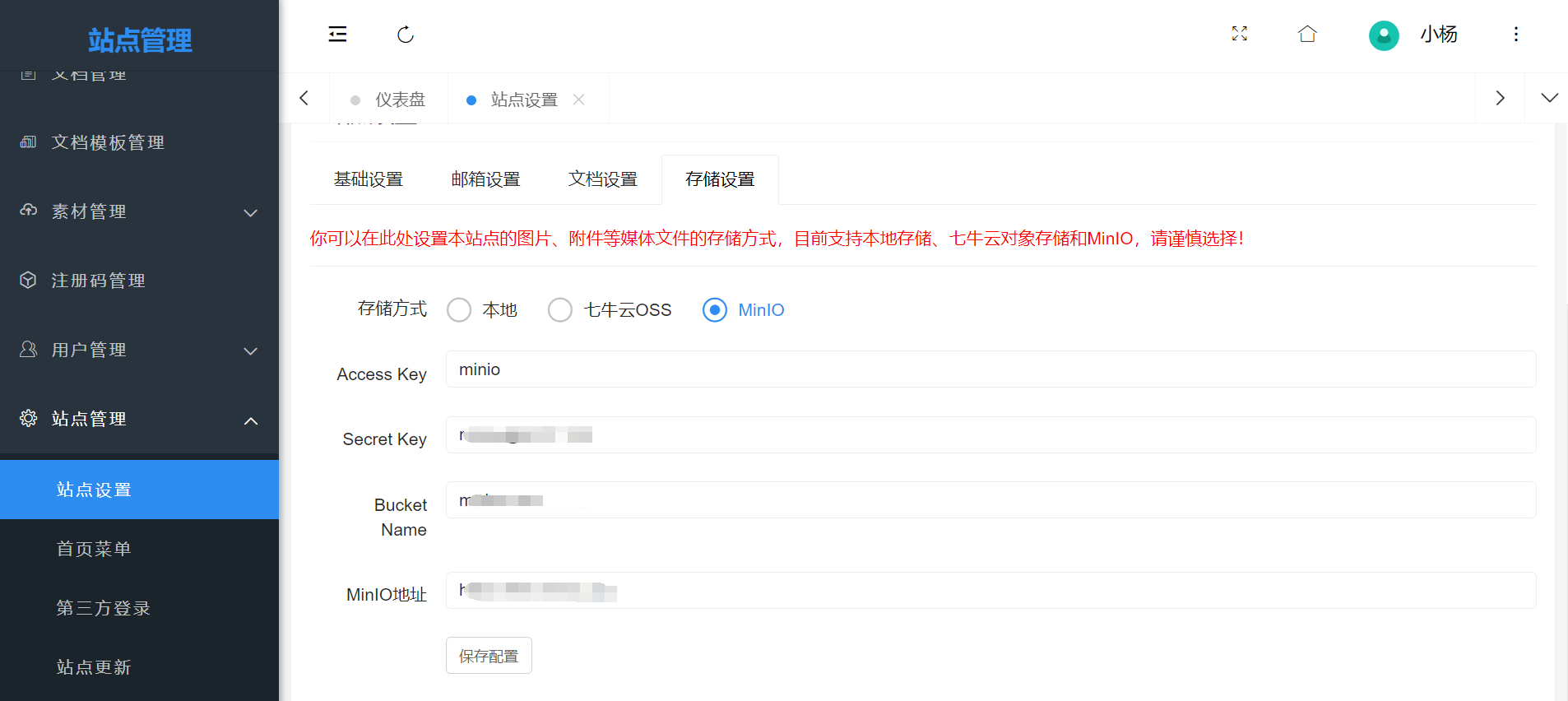 Configuring MinIO requires the following four configuration parameters: - Access Key: The account name for MinIO - Secret Key: The password for the MinIO account - Bucket Name: The name of the MinIO storage bucket - MinIO Address: The API address of MinIO, not the console address