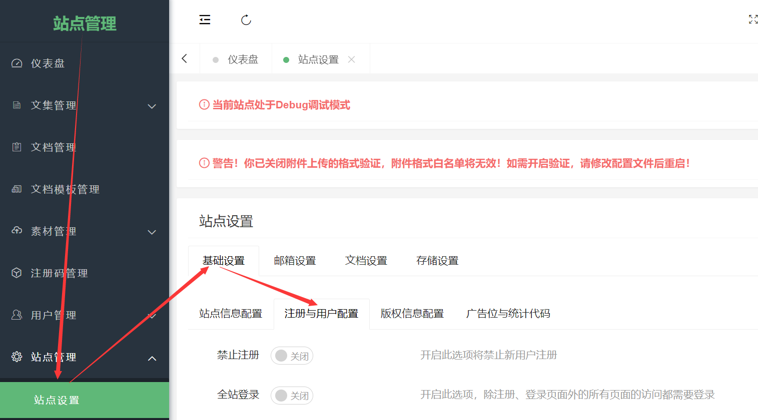 MrDoc supports configuration for user registration, user login, and other functionalities. The configuration paths are as follows: - **Open Source Edition**: Admin Panel → Site Settings - **Professional Edition**: Admin Panel → Site Settings → Basic Settings, as shown below:  Below is an introduction to each configuration item. ## Default Login Method > ⚠️ After setting another default login method, the system login page will become inaccessible, meaning the username + password login method will no longer be supported. The default login method for MrDoc is system username + password. The Professional Edition also supports third-party authentication methods such as DingTalk, Enterprise WeChat, LDAP, and OIDC. Once these third-party authentication methods are configured, the default system login page will display corresponding third-party login icon buttons. If you wish to redirect users directly to the corresponding third-party login link upon accessing the login page, you can set the default login method to a specific third-party authentication. ## Guest Access This setting controls whether to display or hide the login and registration menu links on the collection list homepage and the help center homepage. ## Disable Registration If your site does not need to allow new user registrations, you can enable the "Disable Registration" switch. Once enabled, the registration entry on the page will be closed. Administrators can still create new accounts in the "User Management" page under the Admin Panel. ## Strong Password for Registration By default, MrDoc requires new user registration passwords to be at least 6 characters long and may consist of numbers only. If your usage environment requires high-strength passwords, you can enable the "Strong Password for Registration" switch. Once enabled, the password rules for user registration will be as follows: length ≥ 8 characters, and must include uppercase letters, lowercase letters, numbers, and special symbols. ## Site-Wide Login If you do not want guests (non-logged-in users) to access your site, you can enable the "Site-Wide Login" switch. Once enabled, guests accessing site pages (except for publicly shared collections and documents) will be redirected to the login page. ## Single Sign-On When Single Sign-On is enabled, users cannot be logged in from multiple locations simultaneously. Once a user logs in from one location, other login sessions will be forcibly logged out. ## Registration Code If your site allows user registration but with certain restrictions, you can enable the "Registration Code" feature. Once enabled, users will need to enter a valid registration code to complete their registration successfully. Registration codes can be created and managed in the "Registration Code Management" page under the Admin Panel. ## Registration Code Hint This is a webpage link used to guide users on how to obtain a registration code. If left blank, no hint will be displayed. ## Email Verification for Registration > ⚠️ This feature requires configuring the sender email in the Admin Panel. By default, users can enter any email address during registration. If you need to verify the email address provided by users, you can enable the "Email Verification for Registration" switch. Once enabled, a verification email will be sent to the email address provided during registration. Users must enter the correct verification code from the email to complete the registration. ## Login Captcha By default, users only need to enter their username and password to log in. If you require users to enter a captcha during login, you can enable the "Login Captcha" switch. Once enabled, users will need to enter their username, password, and a captcha to log in. ## New User Permissions > ℹ️ This configuration affects the read and write permissions of all new users, including those registered via third-party authentication. By default, new users have "Read-Only" permissions after registration. You can configure this to "Read-Write" permissions and further control the permissions for new users' collections, documents, images, attachments, etc. ## Default User Group for New Users By default, new users are not assigned to any user group after registration. In many cases, collaboration or viewing permissions for certain collections are restricted to specific user groups. You can specify a default user group for new users so that they are automatically added to it upon registration, eliminating the need for manual assignment.