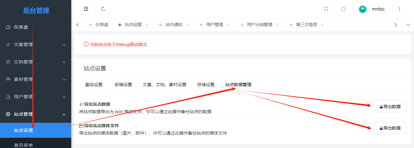 > If you need to perform data export operations on the server, please visit: https://doc.mrdoc.pro/doc/45787/ The site data of MrDoc is primarily divided into two categories: - Database data, including created collections, documents, users, material records, etc.; - Media file data, including uploaded images, attachments, and other data. You can export the above data in the Admin Panel - Site Settings - Site Data Management page, allowing you to download the data to your local machine.